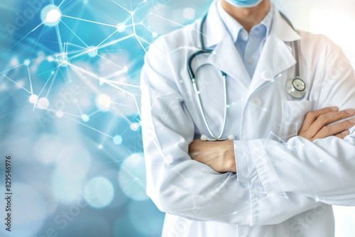 Doctor in uniform holding stethoscope and crossed arms. Hospital or clinic background and copy space