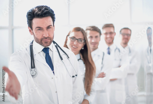 concept, group, team, attention, background, copy space, doctor, medicals, man, male, practitioner, specialist, health care, greeting, hospital, caucasian, physician, care, white, clinic, medicine, profession, hand, uniform, isolated, person, coat, professional, standing, confident, holding, health, staff, friendly, medic, smiling, adult, happy, symbol, 1, portrait, indoor, handshake, occupation, aid, agreements, welcome, people, meeting, adviser