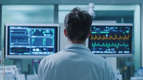 Doctor looking at vital signs monitor, modern healthcare technology, digital medical solutions, back view