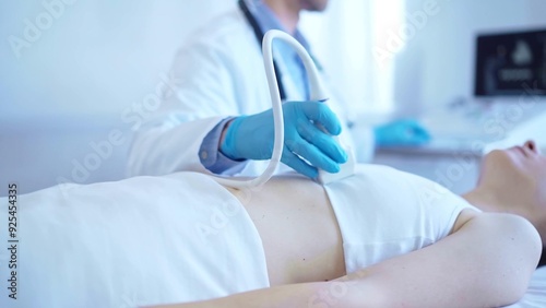Doctor man, wearing blue medical gloves, is using ultrasound machine to examine internal organs of a female woman. Female mammary gland health. Medicine concept