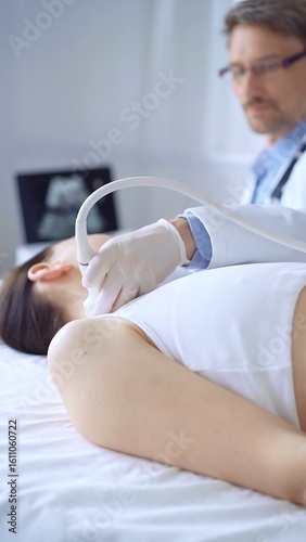 Doctor man wearing white protective gloves is using ultrasound equipment on the neck of patient woman, lying for examination. Medicine concept