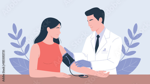 doctor, patient, health care, medicals, check-up, clinic, hospital, cardiology, diagnosis, treatment, consultation, medicine, health, nurse, physician, exam, monitoring, wellness, prevention, therapy, care, support, trust, professional, stethoscope, arm, cuff, measurement, appointment, insurance, illustration, flat, vector, modern, people, woman, man, indoor, design, graphic
