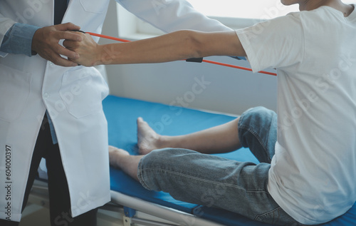 Doctor or physical therapist examines back pain and spinal area to give advice within the rehabilitation center.