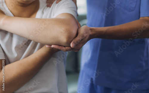Doctor or Physiotherapist working examining treating injured arm of athlete male patient, stretching and exercise, Doing the Rehabilitation therapy pain in clinic.