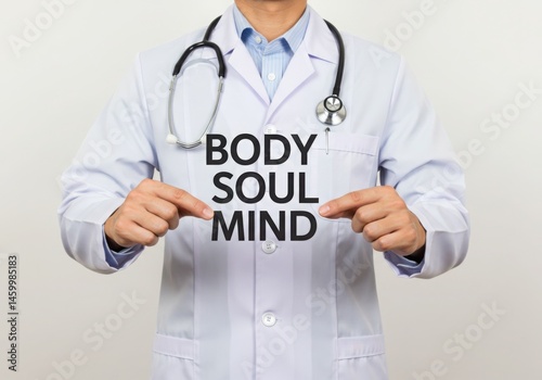 doctor, body, soul, mind, text, white coat, stethoscope, health, wellness, medicals, health care, medicine, well-being, balance, holistic, concept, message, pointing, finger, person, male, professional, uniform, care, treatment, advice, support, awareness, prevention, understanding