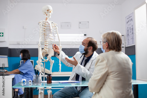 doctor, pointing, skeleton, explaining, human, anatomy, female, doctor's appointment, male, chiropractor, skeletal, structure, to paint, treatment, old woman, advice, assistant, bone, caucasian, clinic, consult, consultation, desk, diagnosis, elderly, face mask, gesticulate, health, health care, hospital, hospital room, man, medical office, orthopedics, physician, professional, reviewing, senior, sitting, solution, specialist, spinal, spine, table, talking
