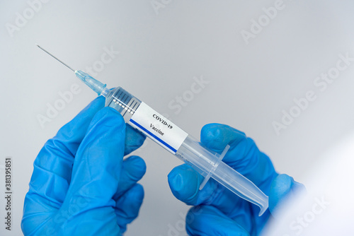 Doctor, scientist, researcher hand in blue gloves or protective suit preparing for human clinical injection trials vaccination covid-19 coronavirus vaccination Biological hazard concept.