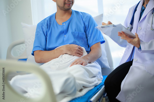Doctor talking with patient in hospital, The doctor is explaining information about various diseases and treatment methods in detail for the patient to understand before treatment.