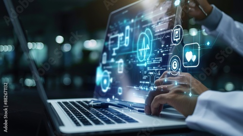 doctor, laptop, digital, technology, health care, interface, icon, health, medicals, datum, information, patient, manage, access, computer, screen, blue, white, hand, typing, keyboard, touching, stethoscope, futuristic, modern, medicine, hospital, clinic, network, connection, online, virtual, treatment, diagnosis, care, electronic, record