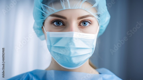 doctor, hospital, portrait, mask, health, female, surgeon, woman, person, care, nurse, medic, face, medicine, young, protection, professional, uniform, clinical, health care, caucasian, virus, occupation, surgery, specialist, blue, epidemic, surgical, eye, background, face mask, sick, flu, physician, disease, closeup, staff, cap, profession, looking, pandemic, human, ai, generative, illustration