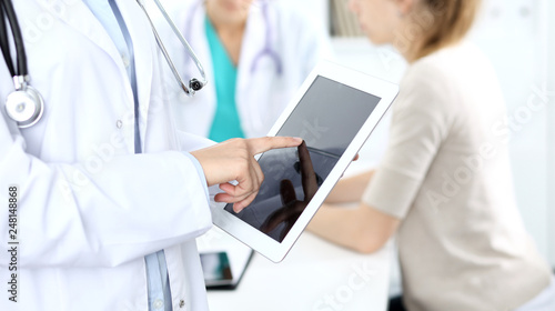 Doctor woman using tablet computer, close-up of hands at touch pad screen. Medicine and data concepts