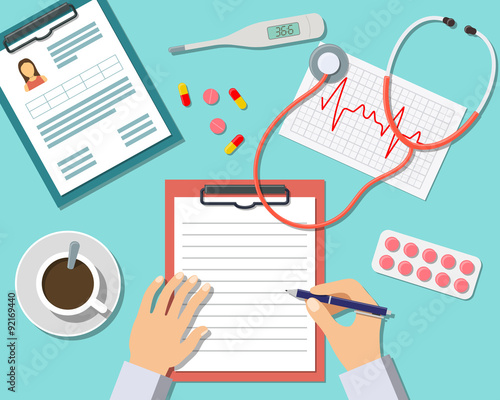 isolated, practice, profession, business, concept, write, laboratory, workspace, stethoscope, pen, treatment, medicine, cardiogram, icon, collection, desk, science, clinical, paper, thermometer, diagnosis, workplace, office, pill, doctor, health care, table, medicals, modern, flat, care, background, health, item, topview