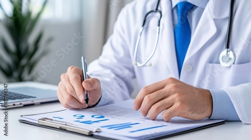 doctor, writing, note, laptop, office, medicals, health care, professional, working, blue tie, stethoscope, clipboard, paperwork, exam, business, technology, modern, focused, serious, document, communication, analysis, desk, indoor, hand, closeup, healthcare professional, equipment, notebook, support, consultation, organisation, strategy, planning, research, routine, information, clinic, service, appointment, documentation, administration, solution, interaction, task