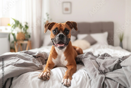 dog, boxer, white, adult, looking, breed, thoroughbred, brown, black, short-haired, young, beautiful, happy, expression, serious, portrait, pet, animal, cute, funny, purebred, large, adorable, pedigreed, domestic, canino, watching, 1, lying down, bed, bedchamber, sheet, blanket, smile, language, room
