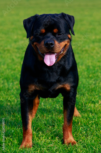 rottweiler, dog, breed, park, green, grass, pet, thoroughbred, plant, young, big, black, muscular, position, friends, 1, background, standing, tongue, wool, short-haired, smile, summer, closeup, outdoors, hair, pedigree, collar, pink, watching