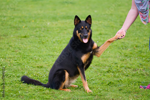malamute, black, brown, canino, chomp, colours, colours, crossbreed, dog, eat, german shepherd dog, green, greengrass, happy, interact, lay, mixture, outdoors, outside, park, paw, pink, play, portrait, pose, purple, red, lady, woman, handler, offer