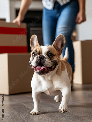 dog, french bulldog, moving, new home, box, wooden floor, excitement, household, pet, happy, relocation, indoor, family, companionship, unpack, living space, joyful, lifestyle, animal, exploration, gesture, human, furniture, transition, cute, playful, furry, breed, happiness, domestic, home, scene, interaction, emotion, activity, environment, comfort, logistic, movement, engagement, area