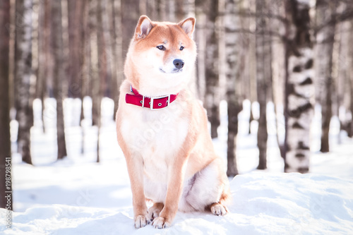 Dog of the Shiba inu breed sits on the snow on a beautiful winter forest background