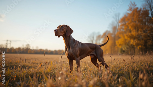 dog, autumn, field, nature, outdoors, grass, tree, forest, brown dog, hunting dog, collar, standing, alert, looking, landscape, autumn color, golden hour, sunset, rural, countryside, pet, animal, mammal, canino, scenery, wilderness, serene, peaceful, calm, beautiful, photo, portrait, seasonal, foliage, leaf, meadow, wild, exploration, adventure, freedom, natural, environment, background, horizon, sky, tranquil, picturesque, scene, golden light