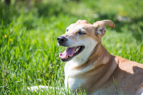 dog playing on grass. dog sporting in nature. big cute dog on sunny day in meadow