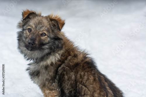 dog puppy shepherd looks at the camera lens on the background of snow blurred background bokeh