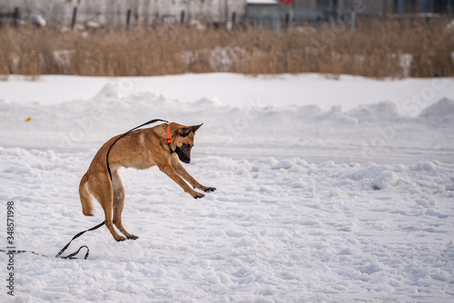 DOG Shepherd plays with the owner