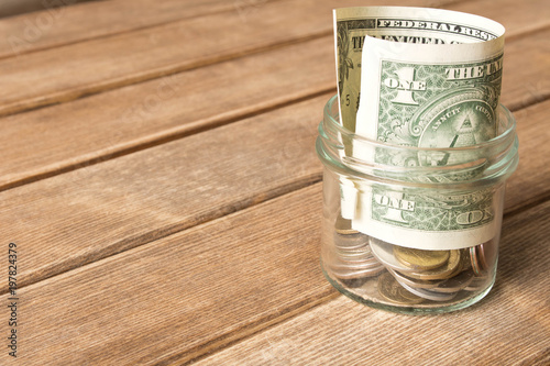 Dollar bill on a wooden table . Last dollar. The concept of poverty
