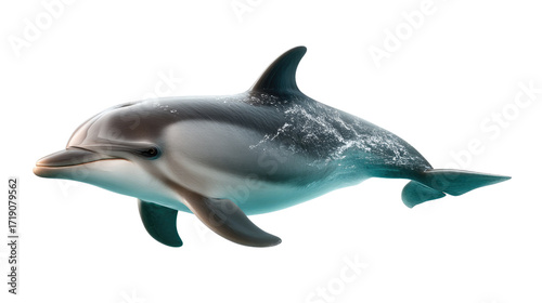 Dolphin in the water: A graceful dolphin is swimming in clear water. The water's surface glistens, and the dolphin's sleek form moves effortlessly through the waves.