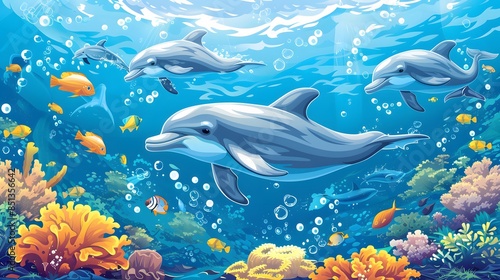 dolphin, coral, reef, underwater, ocean, sea, fish, colourful, blue, green, orange, yellow, bubble, water, sunlight, marin, life, nature, tropical, wildlife, aquatic, animal, illustration, art, digital, painting, cartoon, graphic, design, vector, background, scene, environment, habitat, diversity, ecosystem