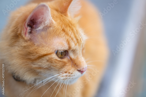 Domestic cat portrait observing and fixing something. Face close up with big green eyes, pink nose and ears, white whiskers, orange-red and white tigererd coat. Macro animal face with selective focus.