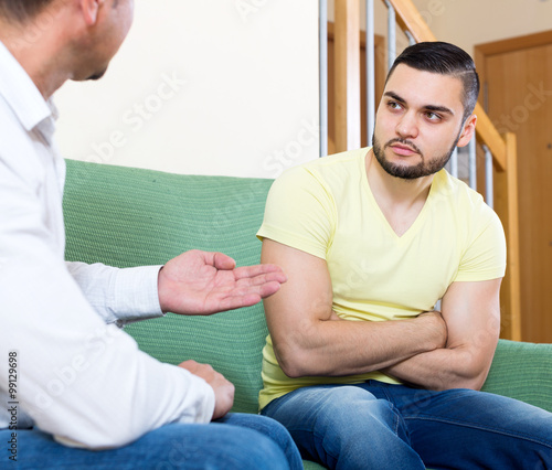 2, male, adult, arguing, indoor, portrait, people, casual attire, clothes, aged, father, son, guy, man, family, negative, caucasian, middle, class, serious, american, crisis, together, lifestyle, domestic, european, to sit, sofa, upset, problem, saying, high, word, abuse, curse, scold, conflict, lack, wrangle, stressed, difficulty, generation, interior, flat, home, 40s