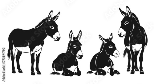 donkey, animal, mammal, standing, sitting, black, white, farm, domestic, equine, isolated, cut-out, transparent, background, animal, portrait, group, silhouette, simple, minimal, flat, outline, farm animal, pet, pack animal, working, stable, field, rural, countryside, character, icon, symbol, web, mobile, app, branding, print