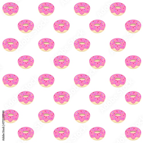Donut seamless pattern. Strawberry donut background. Pink donut with glaze and sprinkle. Seamless Background for Bakery, Cafe, and Dessert Shop Designs