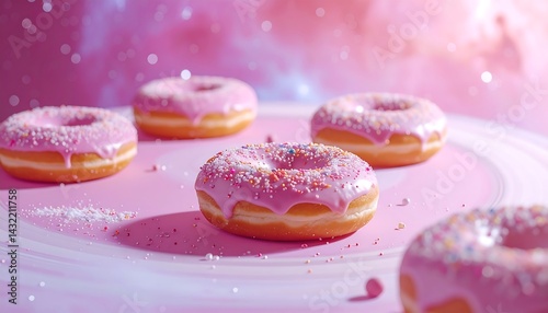 donut, arrange, sweet, cute, happy, bright, studio, tableware, dessert, glaze, sprinkle, plate, background, frosting, pink, food, sugar, snack, confectionery, pastry, galaxy, dough, circle, holiday, bakery, ornament, decoration, celebration, catering, occasion, eating, serving, tasting, sharing