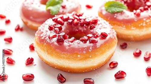 Donut with pomegranate glaze, isolated on a white background with scattered pomegranate seeds and mint leaves