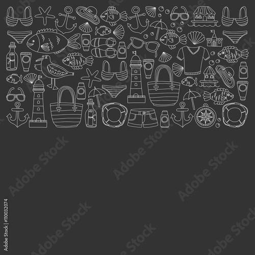 anchor, bag, banner, beach, blackboard, chalk, blackboard, capitan, cartoon, collection, doodle, drawing, fish, hat, helm, icon, children, lighthouse, linear, maldives, menu, moustache, paper, pattern, pen, crayons, poster, relax, sandal, sea, seafood, seagull, set, sheet, shell, simple, starfish, summer, sun, sunglasses, sunblock, swimming, swimwear, tour, travel, umbrella, vacation, line, vector