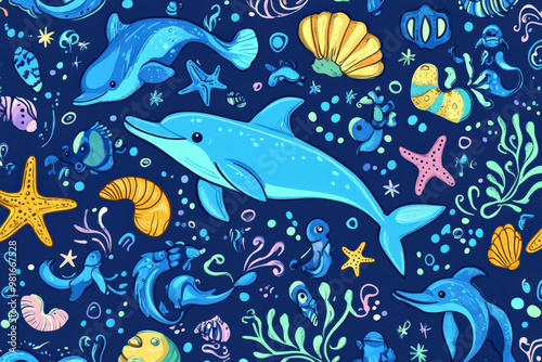Doodle design with ocean creatures like dolphins, starfish, and seashells in vivid blues and greens, great for kids' fabric or wallpaper.