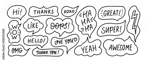 Doodle outline speech bubbles with cute messages. Hand drawn childish funky speech balloons. Hand drawn comic book emotional bubbles. Cute sticker or badges with text, oops, omg, wow.