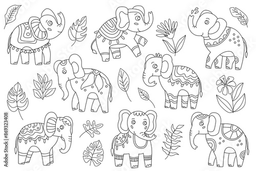 Doodle set with cute elephants and tropical leaves. Vector hand drawn illustration, isolated black outline. Great for coloring