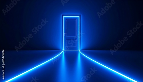 door, entrance, glowing, illumination, blue, light, futuristic, modern, architecture, interior, design, wall, portal, leading, geometric, perspective, line, path, way, entering, bright, dark, shape, indoor, studio, background, conceptual, stage, empty, minimal, opening, corridor, illuminated, surface