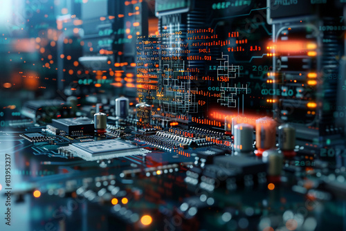Double exposure of a complex logic board, its circuits and components interwoven with the code of an AI algorithm, illustrating the hardware and software collaboration in AI systems.
