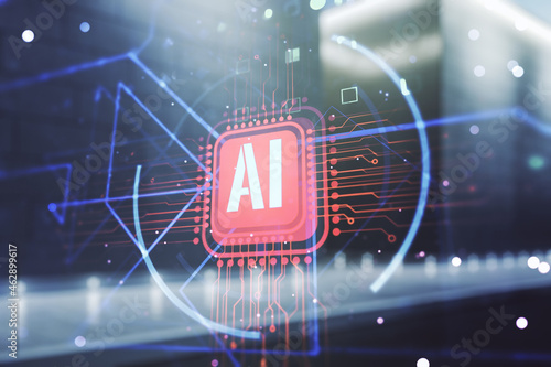 Double exposure of creative artificial Intelligence abbreviation hologram on contemporary business center exterior background. Future technology and AI concept
