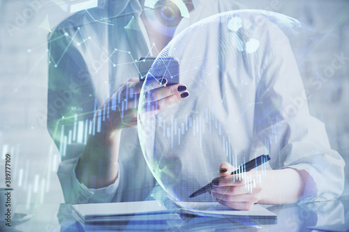 Double exposure of forex chart sketch hologram and woman holding and using a mobile device. Financial market concept.