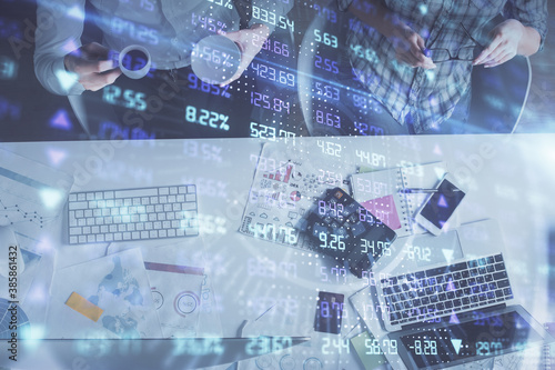 Double exposure of man and woman working together and financial chart hologram drawing. market analysis concept. Computer background. Top View.