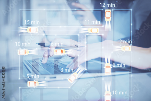 Double exposure of woman hands typing on computer and automobile theme drawing. High Tech concept.