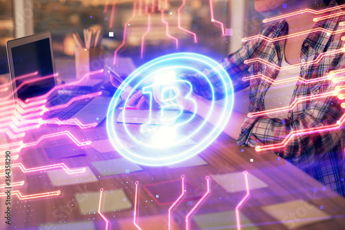 Double exposure of woman hands typing on computer and crypto market theme hologram drawing. Blockchain concept.