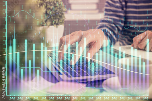 Double exposure of woman hands typing on computer and forex chart hologram drawing. Stock market invest concept.