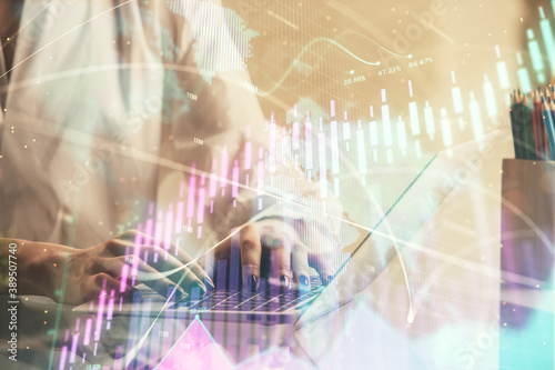 Double exposure of woman hands typing on computer and forex chart hologram drawing. Stock market invest concept.