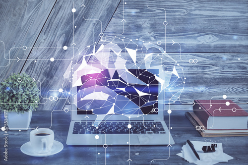 Double exposure of work space with computer and human brain drawing hologram. Brainstorm concept.