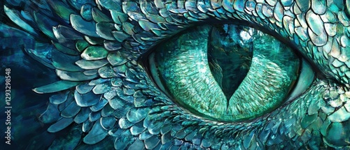 Dragon eye close-up showcasing vibrant green color and detailed scales, illustrating fantasy themes, mythical creatures, and artistic imagination in artwork.
